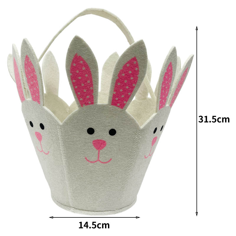 This Easter bunny basket is made primarily of soft, off-white felt, reinforced with delicate stitching, and features a matching handle for easy carrying. The top edge unfolds in a petal shape, with each "petal" transforming into a pair of three-dimensional bunny ears. The inside of the ears is adorned with pink polka dots, echoing the pink details on the face, creating a rich and playful effect. Whether used for toy storage in a children's room, organizing small items in the entryway, or as a candy basket for a holiday party, it adds a touch of cuteness to any space, making it a stylish and functional home essential.